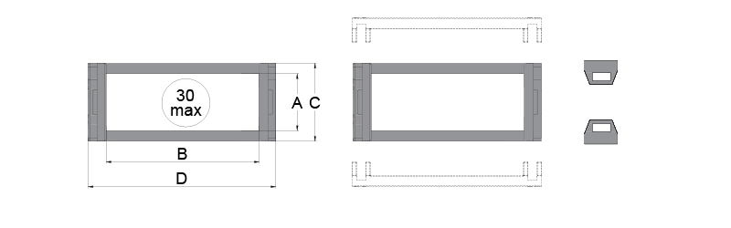 | MODEL | Inner Height (mm) | Inner Lenght (mm) | Outter Height (mm) | Outter Lenght (mm) | Bending Radius | Weight Kg/Mt |